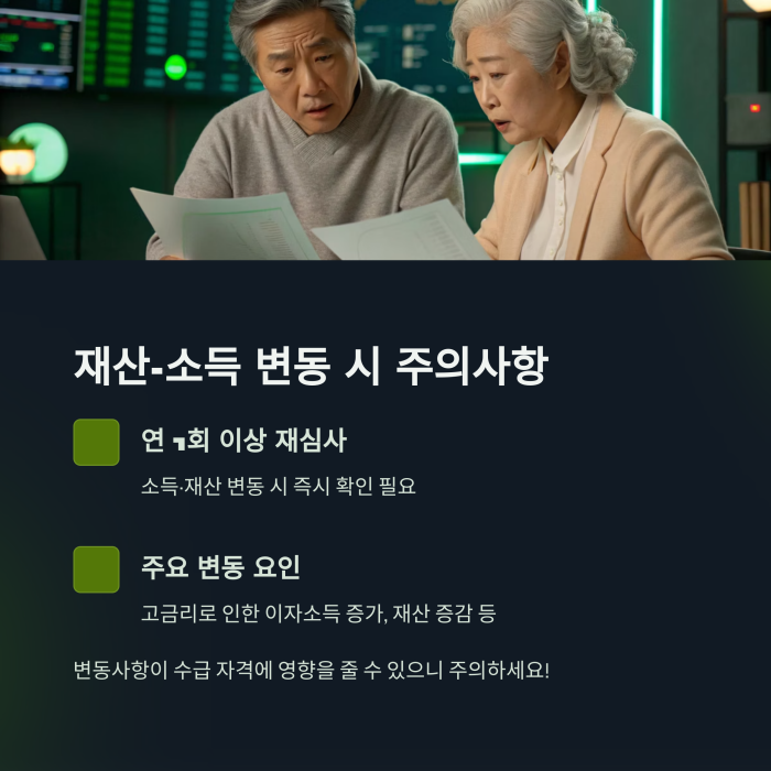 특히 고금리로 인한 이자소득 증가, 재산 증감 등은 수급 자격에 영향을 줄 수 있습니다.