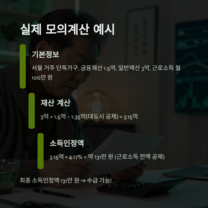 예: 서울 거주 단독가구, 금융재산 1억 5,000만 원, 일반재산 3억 원,